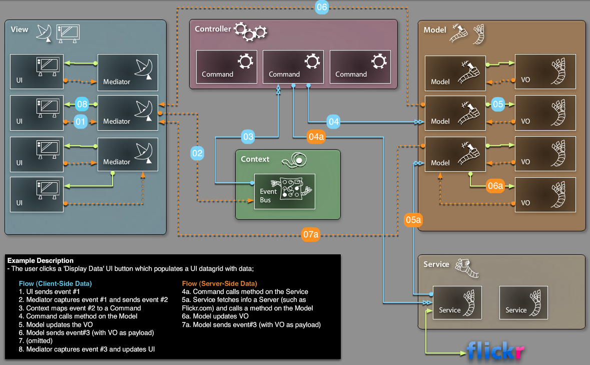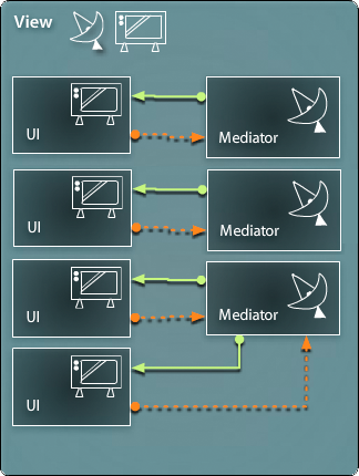 Mediator can recieve events from view components, and translate to the shared central event dispatcher.